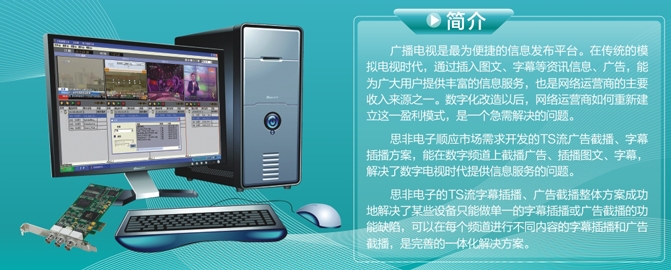 思非電子順應市場需求開發的TS流廣告截播、字幕插播方案,能在數字頻道上截播廣告、插播圖文、字幕,解決了數字電視時代提供信息服務的問題。 思非電子的TS流字幕插播、廣告截播整體方案可以在每個頻道進行不同內容的字幕插播和廣告截播,是完善的一體化解決方案。