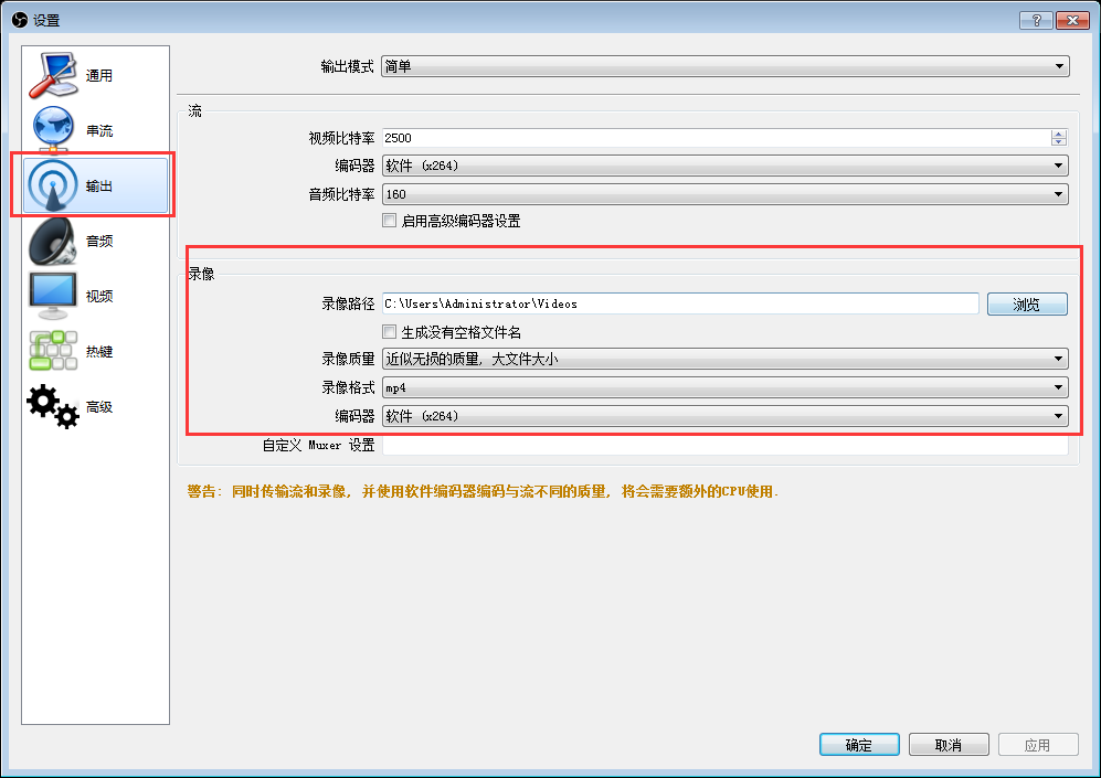 7. OBS Studio視頻錄制,點(diǎn)擊“設(shè)置”,在彈出的視窗中,點(diǎn)擊“輸出”,選擇錄像存儲(chǔ)的位置,錄像質(zhì)量,錄像保持的格式后,回主界面點(diǎn)擊開始錄制,進(jìn)行視頻錄制