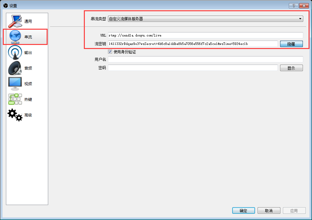 8. OBS Studio視頻直播,點(diǎn)擊“設(shè)置”,在彈出的視窗中,點(diǎn)擊“串流”,在“串流類型”旁下拉框里選擇“自定義流媒體服務(wù)器”,復(fù)制直播平臺(tái)的RTMP地址到“ULC”欄,復(fù)制直播平臺(tái)的直播碼到“流密鑰”欄,點(diǎn)擊“確定”保存,回到主界面點(diǎn)擊“開始串流”進(jìn)行視頻直播