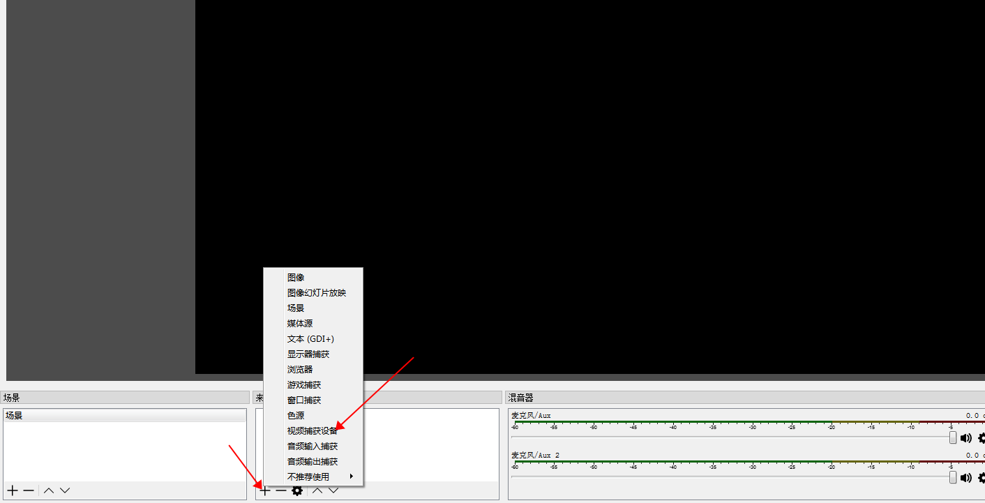 4. 雙擊打開OBS Studi軟件,點(diǎn)擊“來源”窗口下的“+”圖標(biāo),在彈出的窗口中點(diǎn)擊“視頻捕獲設(shè)備”,然后點(diǎn)擊確定;如圖: