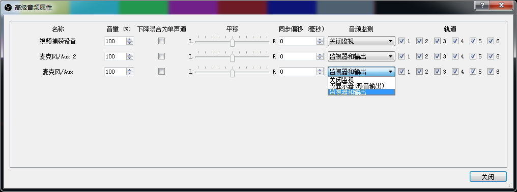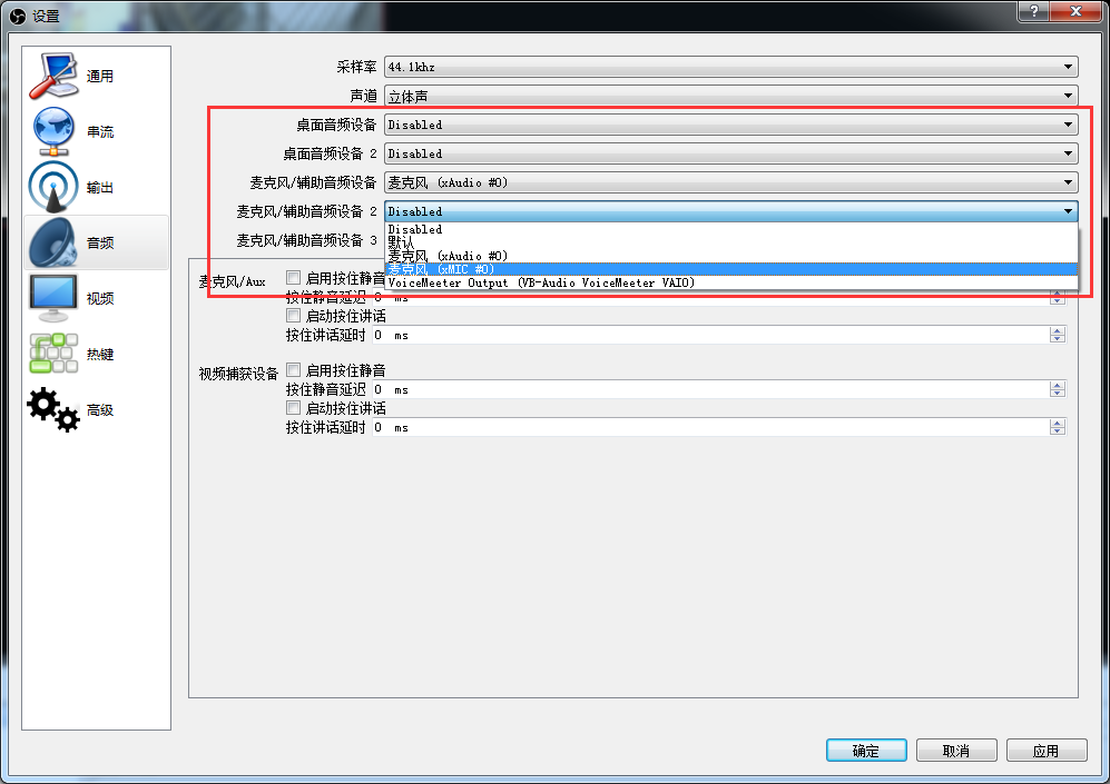 選擇音頻,將“麥克風(fēng)/輔助音頻設(shè)備”選擇采集卡設(shè)備,如果采集卡帶有MIC音頻輸入,在麥克風(fēng)/輔助音頻設(shè)備2選擇采集卡MIC設(shè)備(沒有MIC輸入接口請(qǐng)忽略此步),其他的選Disabled