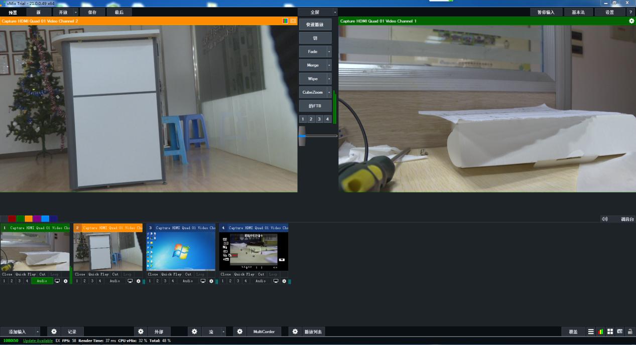5. 設(shè)置好后點擊OK,采集卡采集到的畫面就會顯示在vMix上了,此文檔已添加4路信號;