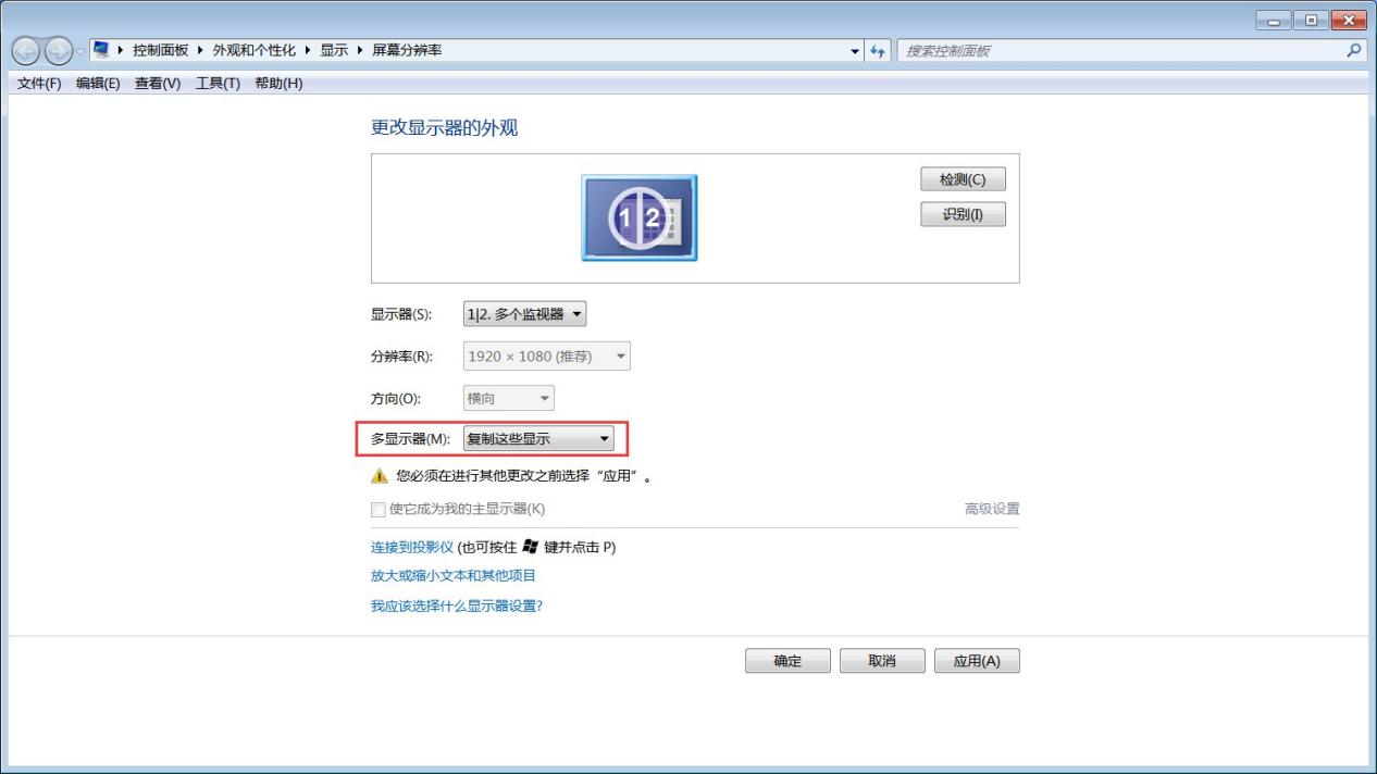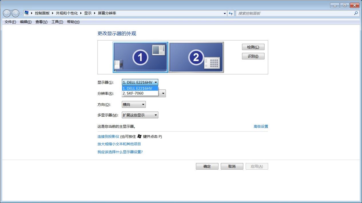 3. 裝好采集卡后用HDMI線連接采集卡和B電腦顯卡,進入分辨率設置,會檢測到有兩個顯示器,1是B電腦顯示器,2是SKF-7060(思非Capture Mini采集卡對應的顯示名稱);