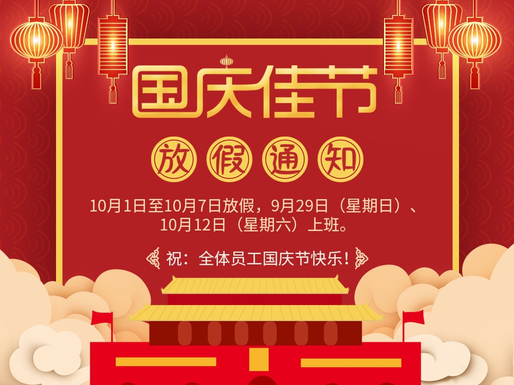 國慶節放假時間為: 10月1日—10月7日,9月28日(周六)放假一天,9月29日(周日)上班,10月12日上班。在國慶長假來臨之際,預祝大家國慶假期愉快和諧、幸福安康!