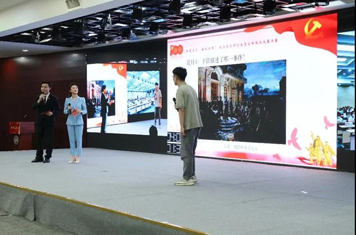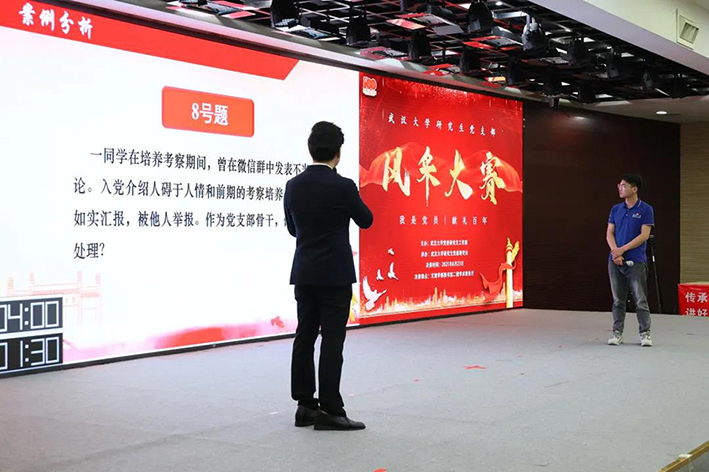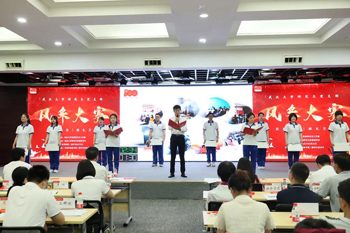 為深入學習貫徹習近平新時代中國特色社會主義思想,慶祝中國共產黨成立100周年,扎實推進黨史學習教育,促進廣大研究生黨員學史明理、學史增信、學史崇德、學史力行,引導青年立志聽黨話、永遠跟黨走,由武漢大學黨委研究生工作部主辦,武漢大學研究生黨建研究會承辦的“我是黨員,獻禮百年”武漢大學研究生黨支部風采大賽于2021年6月23日晚在文理學部圖書館二樓學術報告廳成功舉辦。