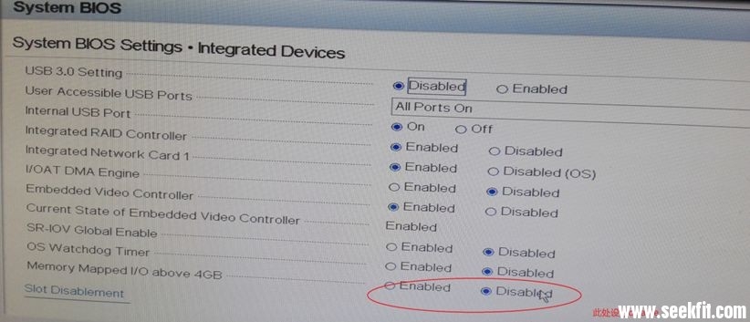 以DELL r730服務器為例: 當電腦啟動后,按F11, 選擇"boot manager"配置, 進入后選擇"SYSTEM Utilities"進入后,選擇"Integrated Devices",進入后將"Memory mapped I/O above 4GB "設為disable即可.
